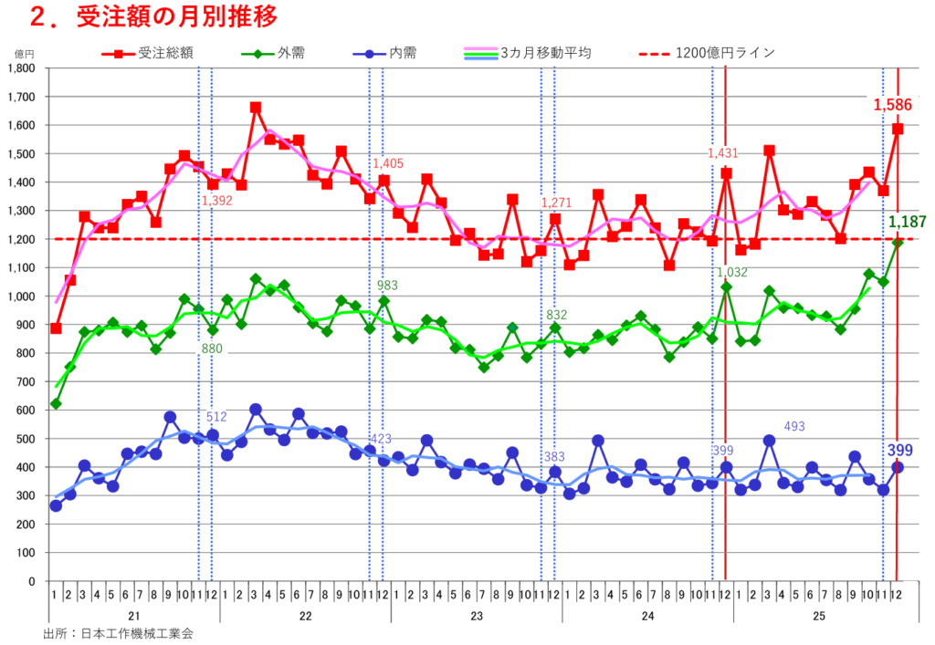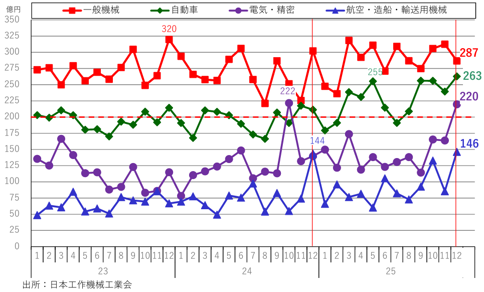 日本工作機械工業会が毎月発表している受注実績は、日本の産業界のバイオリズムを見るうえでも貴重な情報源だ。1月に発表された資料には、直近5年間を軸にした各カテゴリーの受注金額がグラフにされている。そのグラフを抜き出して、この5年間を振り返りこれからの展望を試みた。
