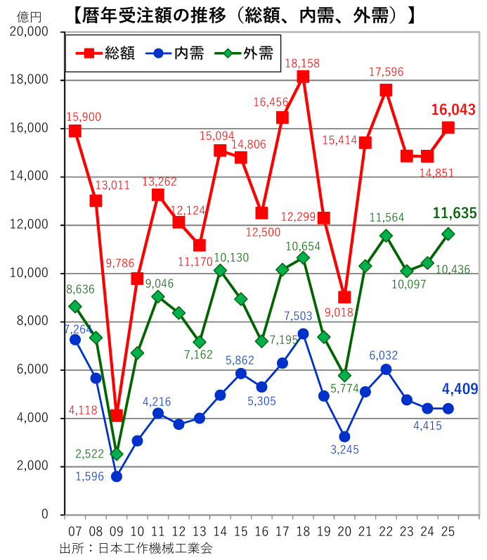 最後にこの直近 19 年の受注総額、内需、外需の推移を示した。外需の伸びに不安がつきまとっていることを示して、本稿を締める。