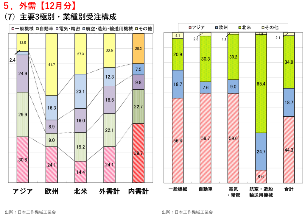 日工会統計の内需は「一般機械」「自動車」「電気・精密」の3分野が取り上げられているが、他に「鉄鋼・非鉄金属」「金属製品」(「電気機械」「精密機械」)「航空・造船・輸送用機械」「その他製造業」「官公需・学校」「その他需要部門」「商社・代理店」の全 11 業種に分類されている。「電気・精密」とされている業種は本来なら「電気機械」と「精密機械」に分けられている。しかし主要業種として「一般機械」「自動車」「電気・精密」にスポットライトが当てられている。それ以外の業種では大きな動きがあったときに特記されるようになっている。