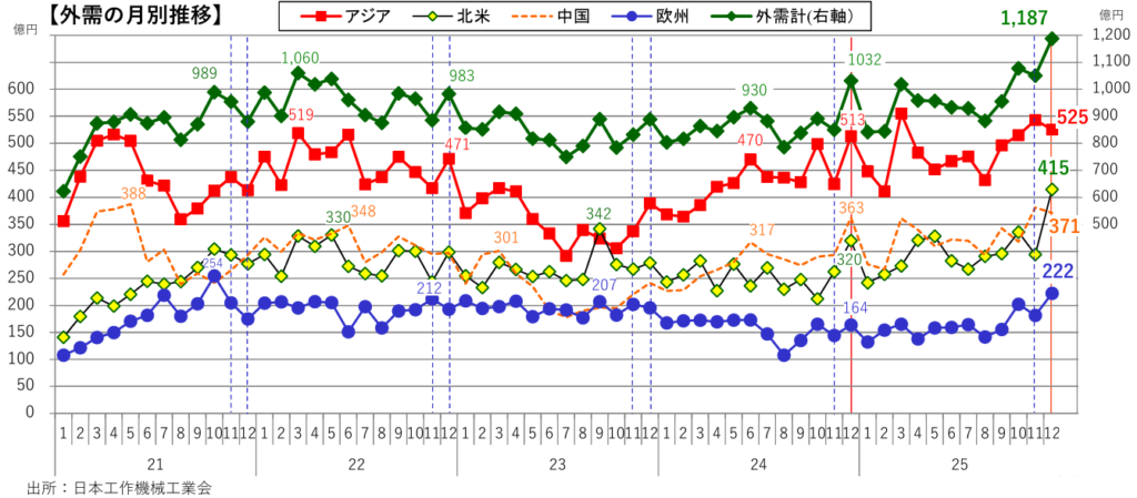 外需「3極(アジア、欧州、北米)の直近5年間の受注動向