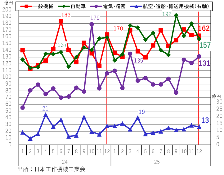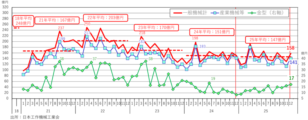 このグラフには各年の「年間平均額」に加えて左上に直近の年平均最高額が 2018 年 207 億円と特記されている。そこから7年後の 2025 年の年平均額は 73 億円とピーク時の 35.2 %にまで低下している。おぼろげな記憶だがバブル経済が崩壊した不景気時の日工会受注は 1993 年 10 月にピークの 27 %まで落ちて上昇に転じた。いま自動車業界はレシプロかハイブリッドかEVか、クルマを動かす根本の原理で混乱している。地方に行くとクルマがないと生活できないが、都市部では交通手段は多岐にわたる。何を選んでも貧乏くじを引きそうで購入意欲は湧いてこない。つい最近までガソリン代は馬鹿みたいに高額だった。そうこうしているうちにクルマは無くてもいいや、という空気が流れてきている。事情通からは東海3県の部品加工屋さんが悲鳴を上げていると伝わってきた。
