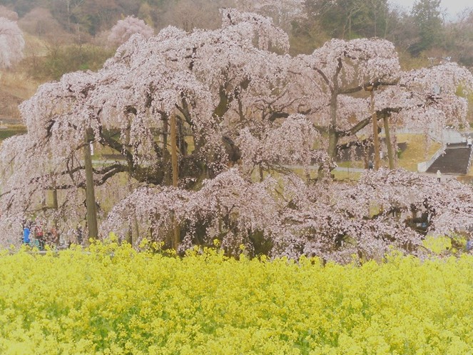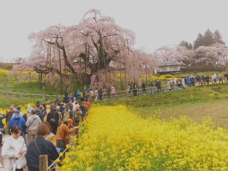 常磐自動車道をひたすら北上し、いわき市を過ぎて『いわきJCT』から磐越自動車道に入った。 ナビでは『船引三春IC』で降りる指示だったが、ひとつ前の『田村SIC(スマートインターチェンジ)』で降りて地道を走った。大変な人手が言われる“滝桜”なので、渋滞を恐れたのだが天候も味方して道路はすいていた。しかも阿武隈山地に抱かれた家々を見ると、枝垂れ桜が随所に植えられていて“滝桜”への期待が膨らむ。
