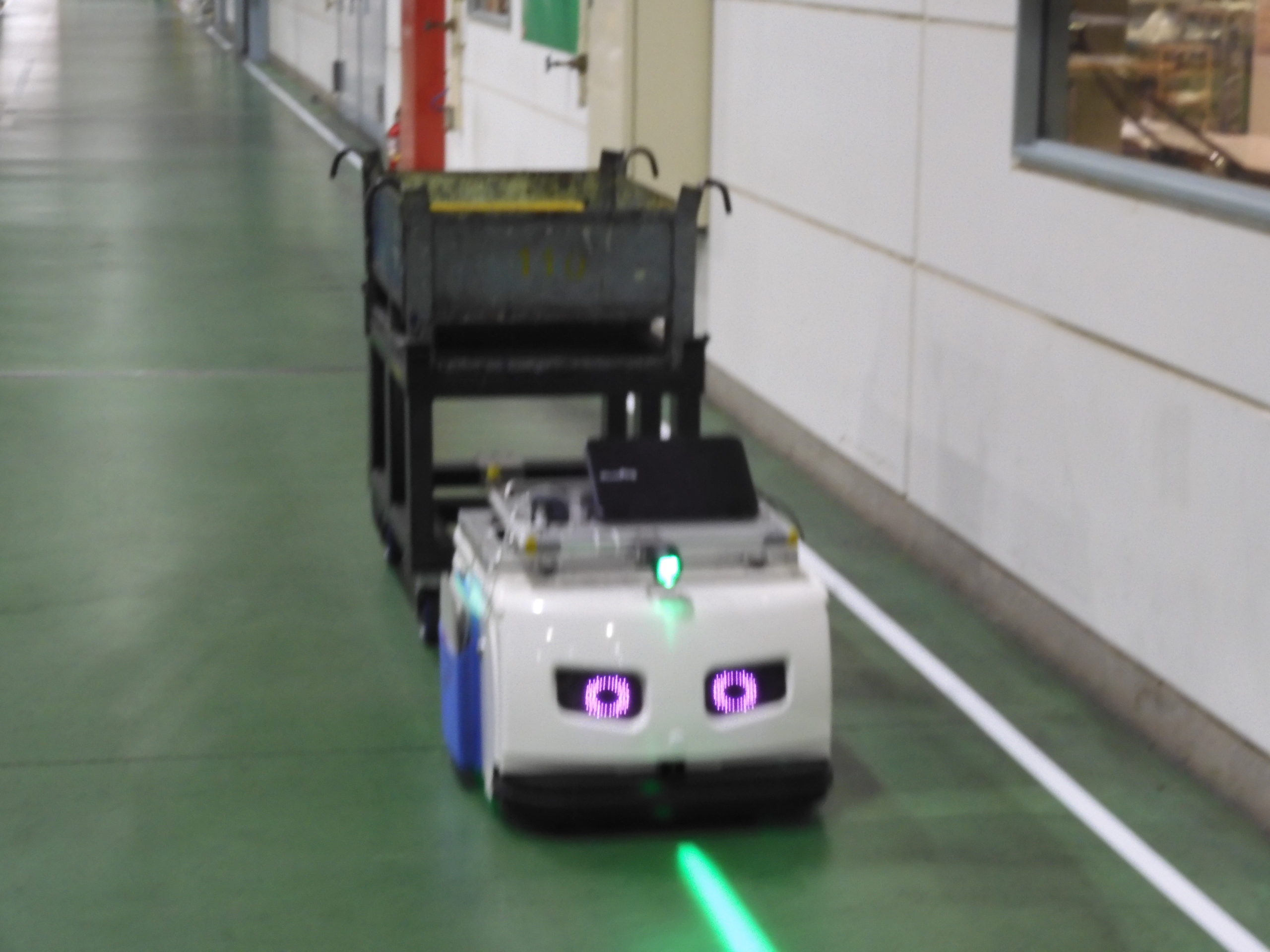 「SIGNAS」は、内蔵カメラで目印となる「サインポスト」を認識しながら自律移動する搬送ロボット。ルートテープを必要とするAGV(無人搬送車)とは異なり、独自の自律移動制御システムを搭載している。前面にある“二つの目”で工場内に表示された「サインポスト」を読み分けながら、目的地にたどり着けるシステムを身に着けている。特別なプログラミング知識がなくても経路設定やルート変更が可能で、ロボット操作に不慣れな現場スタッフでも簡単に、安心して扱うことができる。現在は第一工場と第三工場において稼働中で、工場内には 58 カ所のサインポストがSIGNAS運用に効果を発揮している。導入にあたり床面に手を入れることもなく、走行速度は0.3~0.7m/secの間で、直線部では速くコーナーでは減速して走行としている。