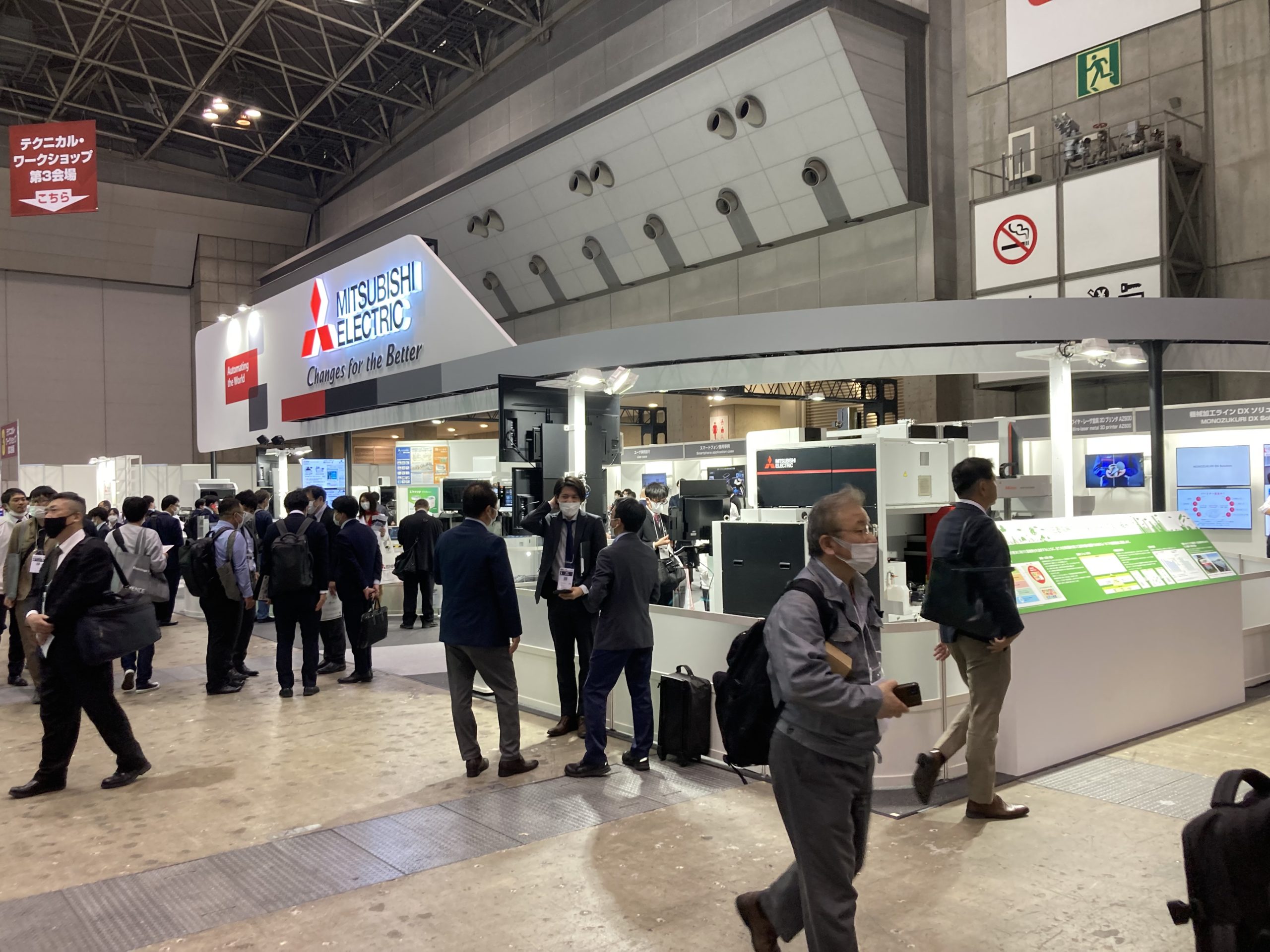 三菱電機は、「カーボンニュートラルとSDGsに貢献する三菱電機の最新技術」をテーマに出展した。同社は、放電加工機はもとよりレーザ加工機、CNC、ロボット、センサ、通信システムなど総合電機メーカーに相応しい製品群が揃っている。金型展だから放電加工機は当然のことながらEVシフトを見据えた電気自動車適応事例やモータ適用事例、スマートフォン適用事例など総合力を発揮したラインナップだ。小間中央には超高精度ワイヤ放電加工機「MP1200」にハンドリングロボット「AMR」のシステムが展示されていた。小間には「三菱電機の社会課題解決への取り組み」のパネルが掲示されていた。また「ワイヤ・レーザ金属3Dプリンタ「AZ600」のサンプルとパネルが、さらに精度を極めた超高精度サンプル事例「極み」など、小間内に所せましと展 示されていた。
