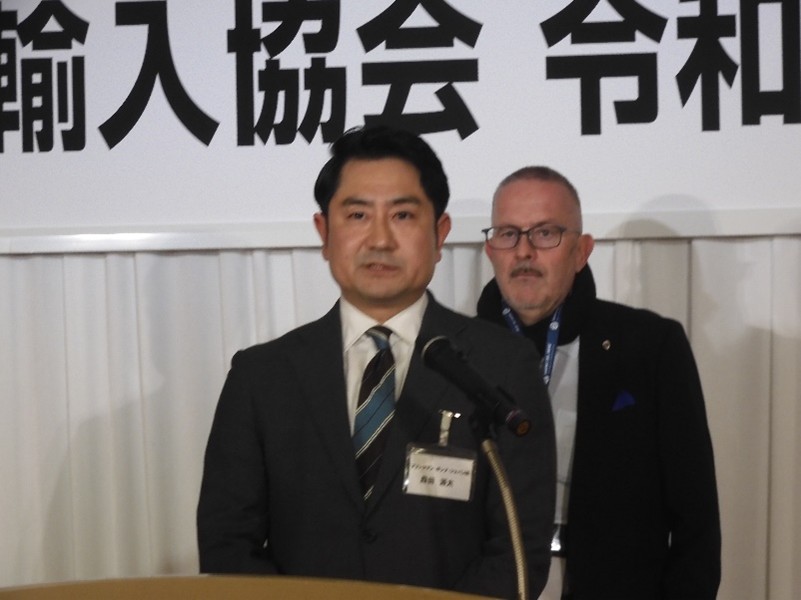 輸入協会に参加した2社が紹介された。左手前がドイツ・ヴェルドーフに本社を置く工作機械産業向けクーラントポンプメーカーのブリンクマン・ポンプ・ジャパン㈱の森田源太社長、右奥がイタリア・フィレンツェに本社を置く物流企業サヴィーノデルベーネジャパン㈱のフラビオ・ゴリ代表取締役。