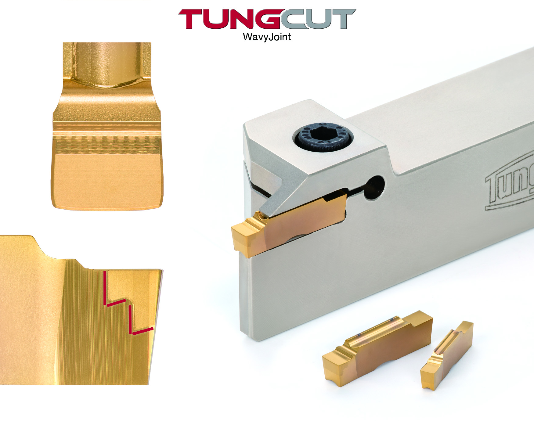 『TungCut』 CBNインサート『STH形』は、これらの課題をまったく新しい発想で解消します。基本形状は従来の『TungCut』用溝入れ用インサートを踏襲していますが、『STH形』は横送りすることで仕上げ加工を行います。また、切れ刃の正面側に曲率半径の大きなワイパー切れ刃を備えており、0.1mm程度の切込みと、最大1.5mm/revの超高送り条件で使用することで非常に優れた加工面粗さが得られます。さらに、切れ刃の側面側に施されたワイパー切れ刃により、立壁の仕上げ加工でも威力を発揮します。加えて、ろう付け面積を広くできる『WavyJoint』(ウェイビー・ジョイント)形状を採用したことで、高送り加工でも切削熱によるろう材の軟化を防ぎます。