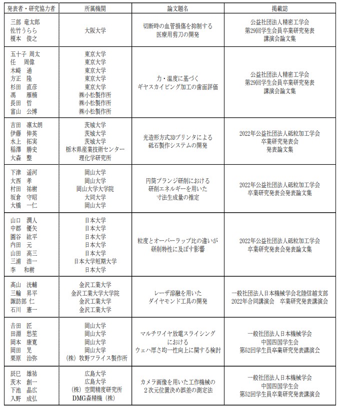 第 43 次工作機械技術振興賞・論文賞 (同不順、敬称略)