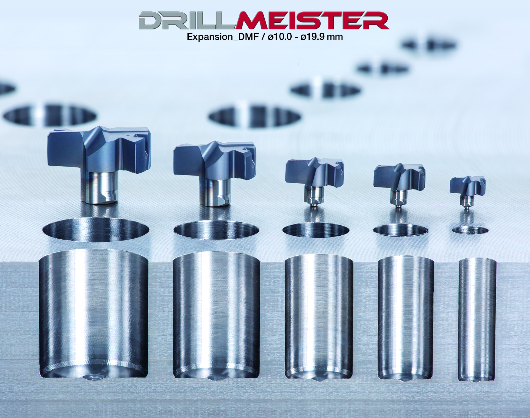 『DrillMeister』は、超硬ソリッドドリルと肩を並べる切削性能と刃先交換式ドリルの利便性を兼ね備えた画期的なヘッド交換式ドリルです。今回、座繰り穴加工用ヘッドDMF形の設定ドリル径を拡充します。