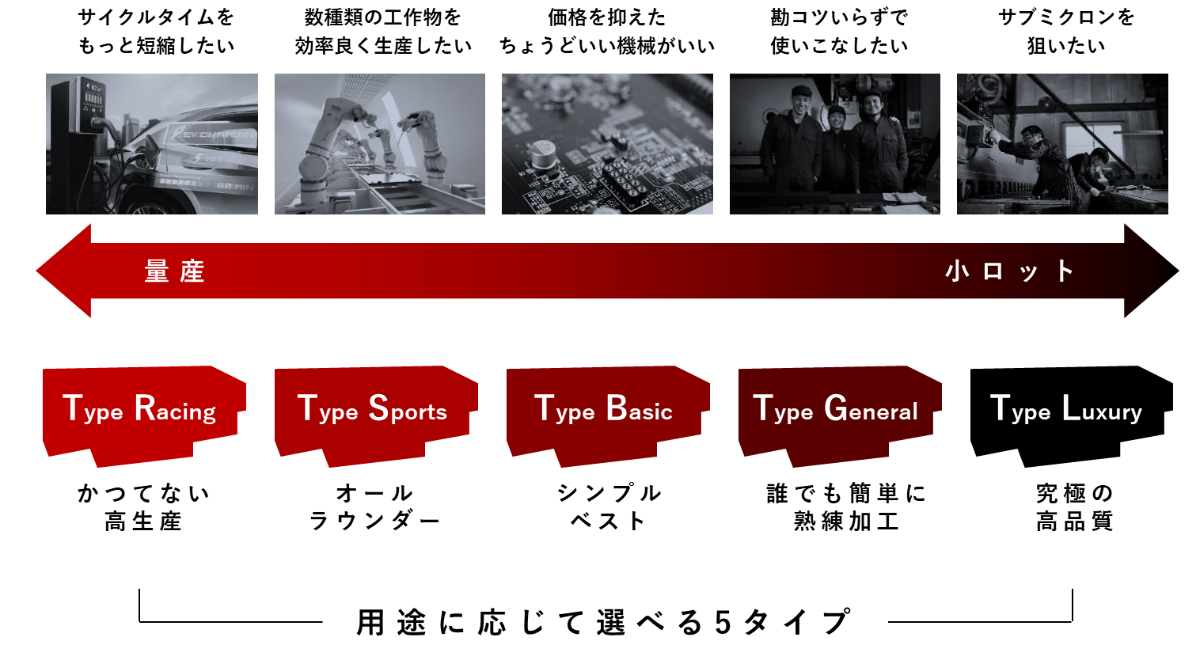 一般機械、スピンドル、ロール、工具、ツールホルダなどの研削に最適で、誰でも簡単に熟練加工ができる Type G と究極の高品質を実現する Type L をはじめ、5タイプすべてを販売します。