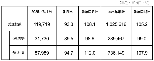 日本工作機械工業会/ 2025年8月分 受注額速報