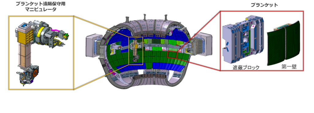 ブランケット(第一壁と遮蔽ブロック)と遠隔保守用マニピュレータ(上)
