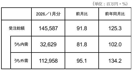 日本工作機械工業会/ 2026年1月分 受注額速報