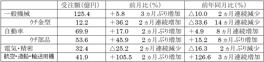 ・産業機械及び⾦型は前⽉⽐で増加するも依然として低⽔準での受注が続く