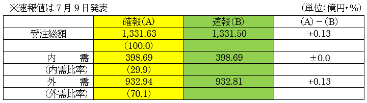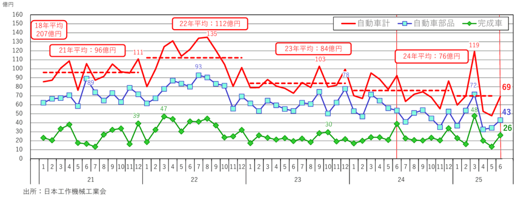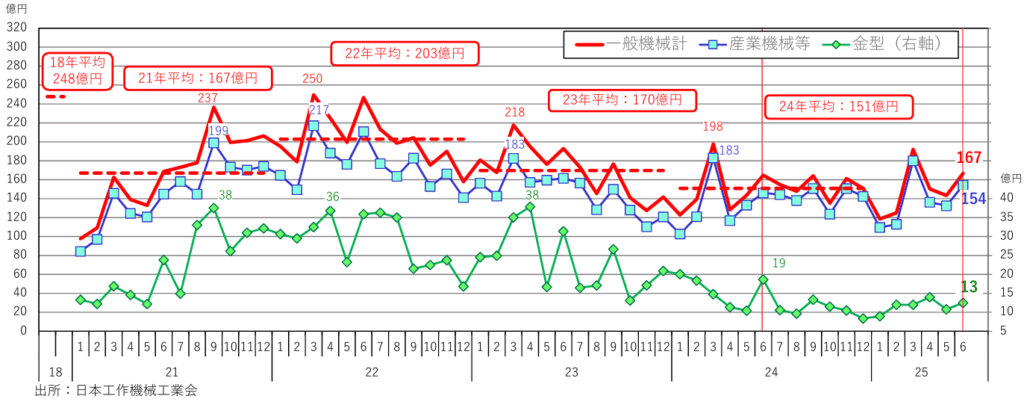 2025 年の5⽉までの暦年受注額の累計は、前年同期⽐+ 4.7 %と伸⻑した。これは「内燃機関向けのまとまった受注とデータセンタ向けの投資が続いたことによるもの」とした。更に「関税措置が経済の不安定化、不確実性を招いているが、政府より製造業に向けた減税などインセンティブが公表され、年後半の回復に期待している。」とコメントしている。