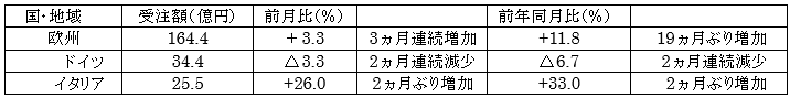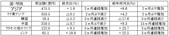 「アジア」(475 億円)は、前月比で2カ月連続、前年同月比で2カ月ぶりにそれぞれ増加し、5カ月連続で 450 億円を超えた。中国が5カ月連続で 300 億円を上回ったほか、インドは4カ月ぶりの 60 億円超、ベトナムも2カ月連続で約 30 億円の受注が続いた。