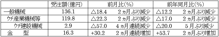 業種別に見ると、「一般機械」(136 億円)、「電気・精密」(40 億円)、「金属製品」(24 億円)等が前月比・前年同月比とも減少した一方、「自動車」(80 億円)は前月比で2カ月連続、前年同月比では4カ月ぶりにそれぞれ増加した。また「航空機・造船・輸送 用機械」(23 億円)は航空機、船舶、鉄道とも比較的活発で、自動車と同じく、前月比・ 前年同月比とも増加した。各業種とも大手・中堅ユーザによるまとまった規模の投資がけん引しており、中小企業ユーザは各種補助金への高い依存が感じられる。