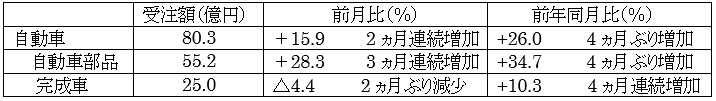 ・⾃動⾞向けは、2カ⽉連続で前年⽐で増加し、4カ⽉ぶりに 80 億円超えとなった。