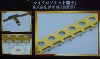 内側にらせん階段がある。それが二重らせんになっている。それの上と下が繋がっていて“無限に”繋がっている。これは「単体の部」で一枚の板からで曲げ加工を手でやっている。外側は内側のらせん階段を支えている。微細な技術も評価された。前回も「王冠」で受賞されているが、今回はそれに加えて新たな作品に仕上げた。経済産業大臣賞 マイクロソケット端子 ㈱鈴木(長野県)~※スライド左下に映る米粒に注目!