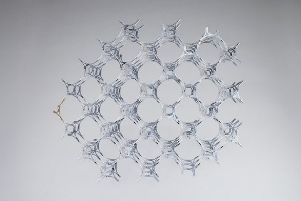 三次元形状の三又の部品を二次元の部品に展開している。数学的なデザインを工夫している。見る方向では六画形の穴になり、少し角度をずらすと四角形になる。構造的にも考えられたデザインだ。三又の角度は 70.529 度と算出されていて、この角度を計算したのが名古屋工業大学で、成形したのが志村プレスという産学連携の新しい取り組だ。
