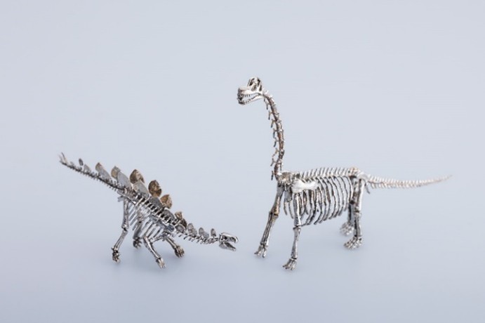 スティーブン・スピルバーグの「ジェラシックパーク」や「ジェラシックワールド」に登場した有名な草食と肉食の恐竜。骨格を模していた微細なものを作ったが考えられるのが溶接の問題。こちらは0.1mmのステンレスワイヤをレーザで溶接した。非常に細かい加工をしている。寸法自体は 50 mm程度。それをアディティブマニュファクチャリングで作った新しい取り組みが評価された。